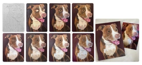 Progress photos showing the stages of Major’s portrait, from sketch to completed work